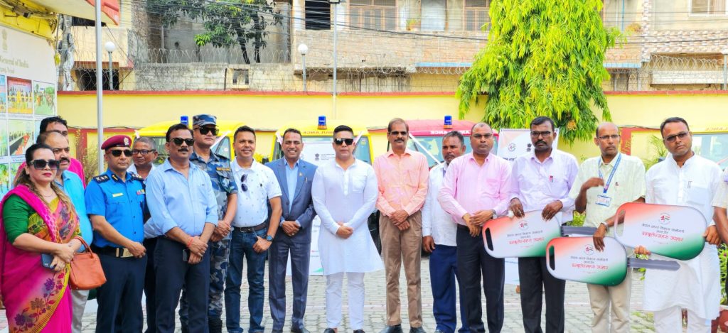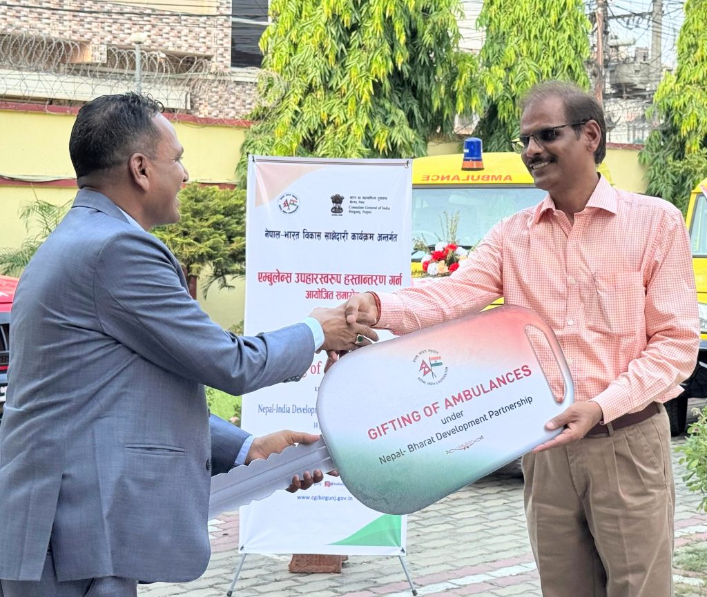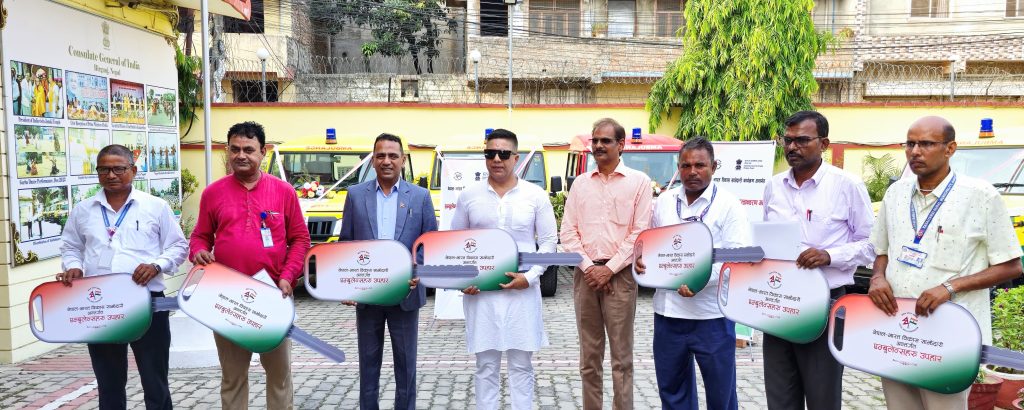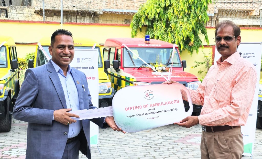 नेपाल भारत विकास साझेदारी कार्यक्रम अन्तर्गत मधेस प्रदेशलाई १ वटा र मधेस प्रदेशका ५ पालिकालाई १/१ वटा गरी जम्मा ६ वटा एम्बुलेन्स हस्तान्तरण गरिएको कुरा महावाणिज्य दूतावासले जनाएको छ।