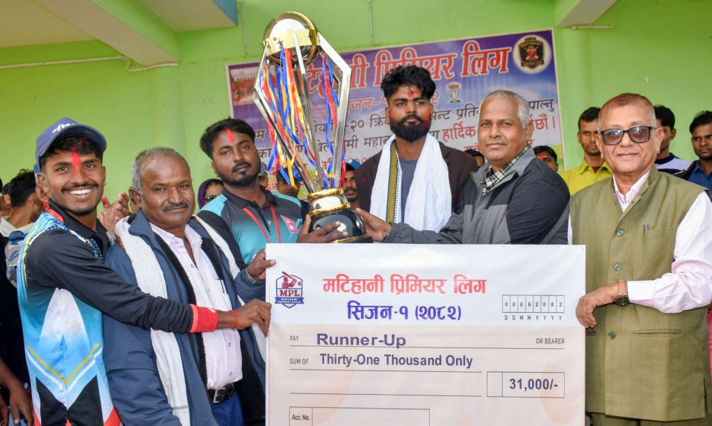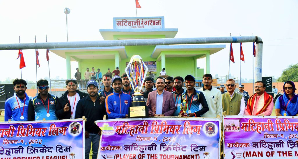 महोत्तरी । मटिहानी नगरपालिका–७ स्थित मटिहानी रंगशालामा मटिहानी क्रिकेट टिमद्वारा आयोजित मटिहानी प्रिमियर लिग (MPL) सिजन–१, २०८२ आज एक भव्य समारोहका साथ सम्पन्न भएको छ।